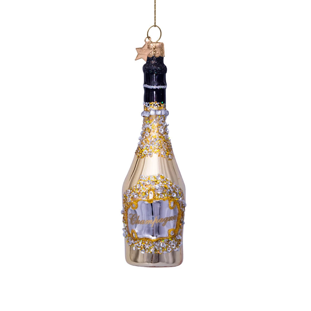 Gold Champagne Bottle Ornament, Glass, Approximately 6.25″H