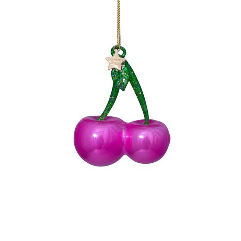 Opalescent Pink Cherry Ornament by Vondels. Hand painted and mouth blown. Approximately 3″H.